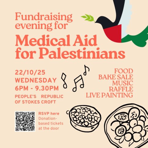Food, bake sale, music, raffle, & live painting, all to raise money for Medical Aid for Palestinians!