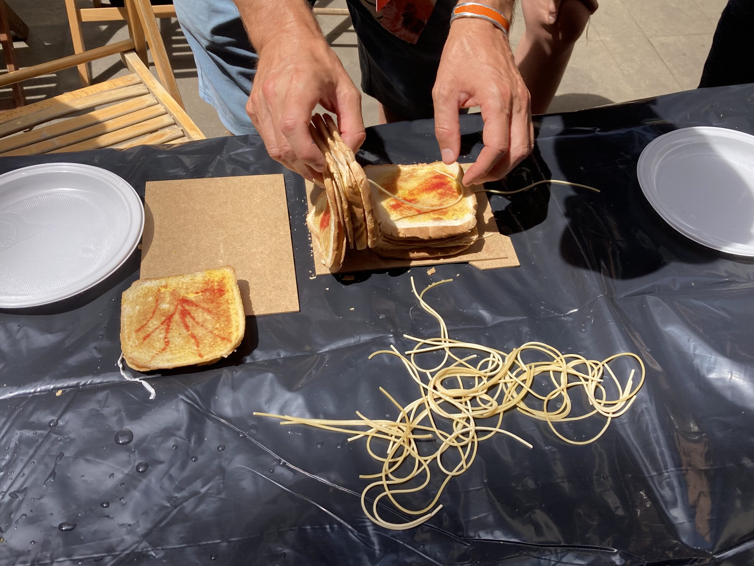 Among these drivers is Justin Quinnell, a pinhole photographer from Bristol, England. Quinnell steered a large group through turmeric anthotypes on bread followed by a crash course in making ice lenses. With a concoction of isopropyl alcohol (essentially washing-up liquid), turmeric, bread, and an assortment of swan and butterfly stencils, added with fifteen minutes of sun, participants were left with their own edible creations. The anthotypes were then bound by al dente spaghetti into a bread photobook.